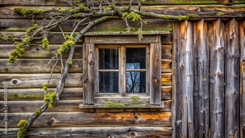 Rustic Wooden Cabin Exterior with Mossy Branch and Aged Window