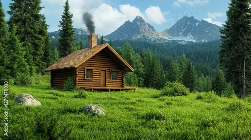 Rustic Wooden Cabin in a Mountain Meadow with Snow Capped Peaks