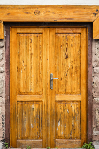 Rustic wooden door with metal handle on stone wall background