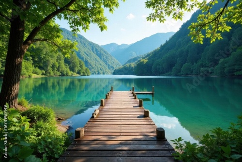 Rustic wooden pier stretches over tranquil lake, lush greenery surrounds , green, idyllic, stock