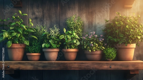 Rustic wooden shelf with potted herbs in warm light.