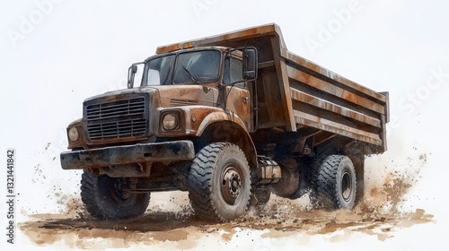 Rusty dump truck driving on a dirt road, watercolor painting. The truck is brown and shows signs of wear and tear. The background is mostly white.
