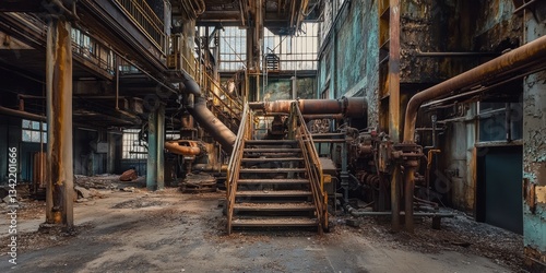 Rusty industrial staircase leading to decaying machinery in abandoned factory