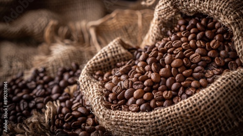Sack of roasted coffee beans on burlap