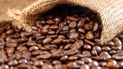 Sack of Whole Coffee Beans Spilling onto Burlap Surface for Premium Aroma : Generative AI