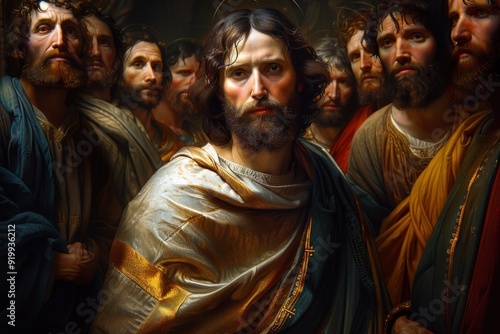 Sacred depiction: portrait of Jesus Christ with his 12 apostles, bond of faith and discipleship, spiritual connection and shared mission of followers with their revered teacher.