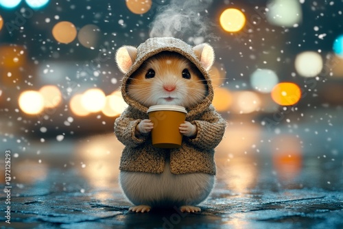 Sad cute baby animal hamster in winter warm clothes, holding steaming cup with rising steam in paws. Social ad campaign - animal care. Problem of struggling animals. Zoo conservation program.