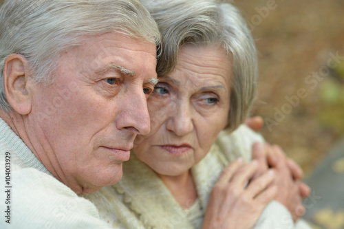 Sad senior couple in park