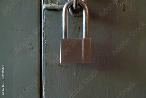 Safety stainless steel padlock on gate of small gray container closeup . High quality photo, stock photo.