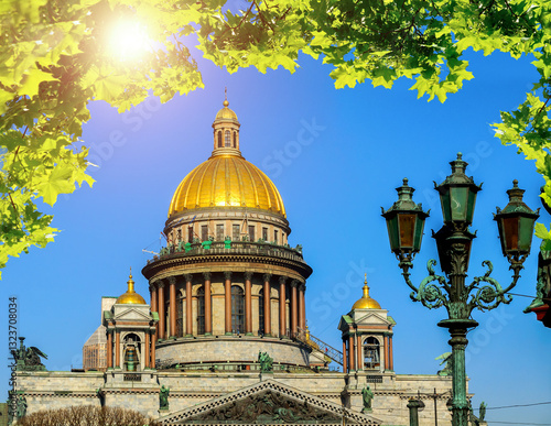 Saint Isaacs Cathedral in Saint Petersburg, Russia framed by green leaves with sunshine breaking through them