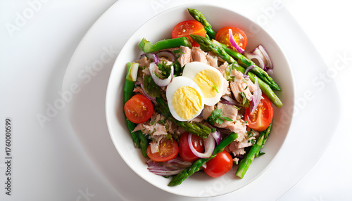 Salad with tuna, tomatoes, asparagus and onion. Salad Nicoise. Flat lay. Top view