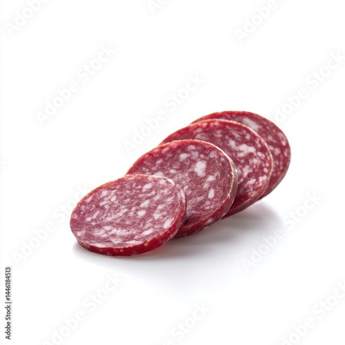 Salami slices arranged in row isolated on white background