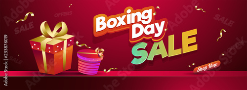 Sale header or poster design, sticker style text Boxing Day with gift boxes on shiny brown background.