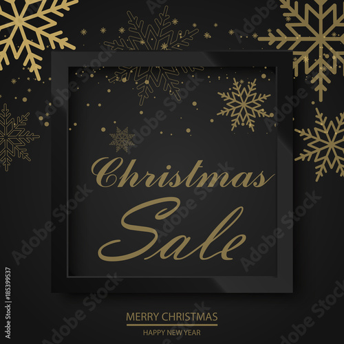 Sale poster with falling snowflakes glossy black frame on black background. Vector