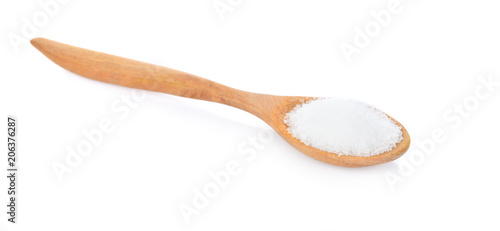 Salt in wooden spoon on white background