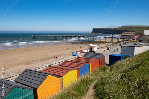 Saltburn By The Sea, beach huts at a traditional english holiday resort.