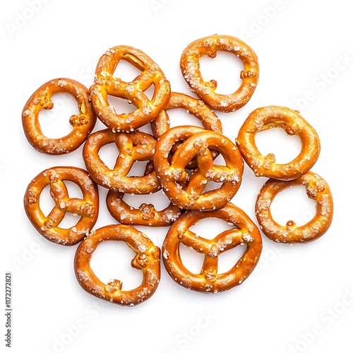 Salted pretzels pile, party snacks isolated on white, top view