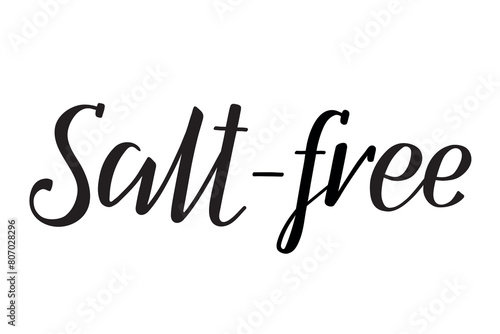 Salt-free. Handwritten lettering. Inscription in English. Modern brush ink calligraphy. Black isolated words on white background. Vector text. Food ingredients label, nutritional information.