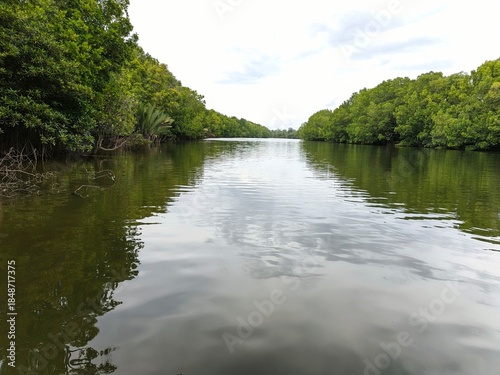 Saltwater rivers on the left and right sides of the mangrove forest with a cloudy sky in the background.