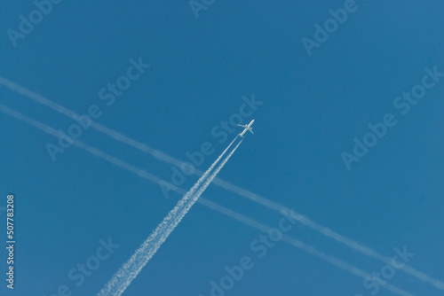 Samolot lecący po bezchmurnym, niebieskim niebie pozostawiający białą smugę kondensacyjną, krzyżującą się ze smugą przelatującego wcześniej samolotu.