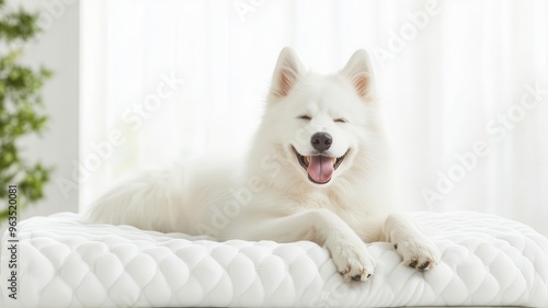 Samoyed enjoying a cooling pad in a high-tech pet wellness center, pet wellness, innovation
