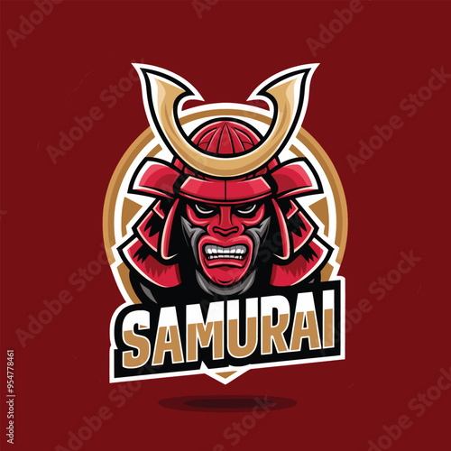 samurai design character logo with text on red background