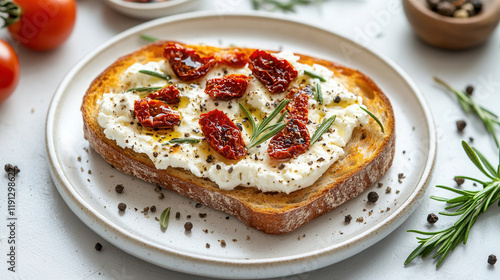 sandwich snack toasted bread topped with feta, sun-dried tomatoes, and rosemary on a white plate