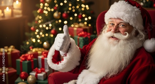 Santa claus giving thumbs up in front of christmas tree with wrapped presents and holiday lights for festive celebration mood