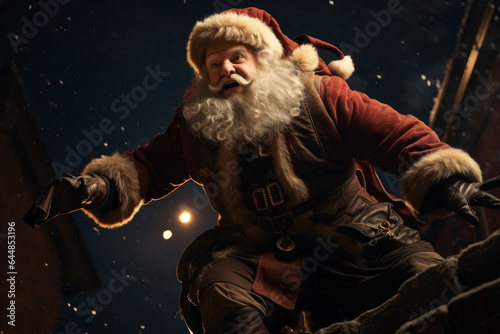 Santa Claus, illuminated by a full moon, as he prepares to descend from the rooftop to deliver gifts. The composition captures the anticipation and wonder of Santa's arrival. Generative Ai