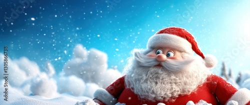 Santa Claus in a snowy landscape, festive atmosphere with a cheerful expression, evoking holiday spirit.