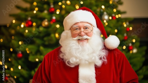 Santa Claus is smiling and wearing a red suit