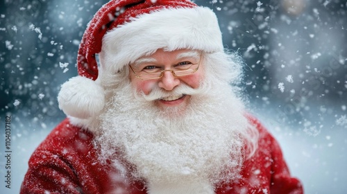 Santa Claus looking away with a gentle smile, snowfall framing his joyful face.