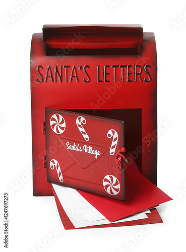 Santa Claus mail box with letters isolated on white. Christmas tradition