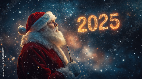 Santa Claus paints the numbers 2025 with a magic brush.