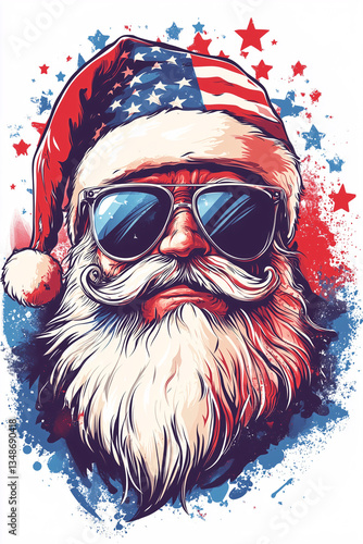 Santa claus portrait wearing sunglasses and an american flag hat, celebrating a patriotic christmas with stars and stripes