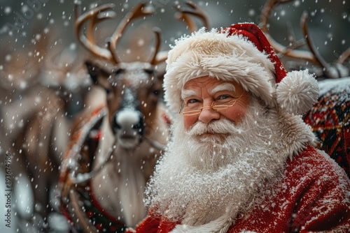 Santa Claus smiling in snowfall with reindeers in the background, capturing the essence of Christmas joy and holiday spirit.
