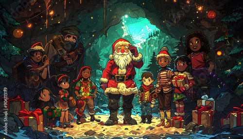 Santa Claus Surprises Children in a Cave with Gifts