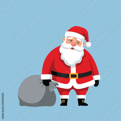 Santa Claus wearing traditional red suit standing with grey sack on blue background festive Christmas character vector