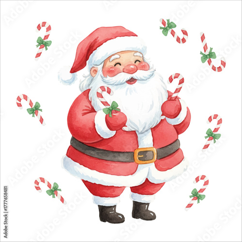 Santa Hanging Candy Canes Watercolor Illustration, Cute Christmas Decor Scene