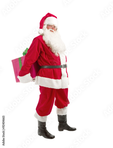 Santa Holding Christmas Present in his Hands on a White Backgrou
