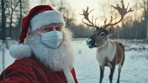 Santa Selfie: A happy Santa captures the festive spirit and joy of Christmas by taking a selfie with his reindeer in a snowy winter wonderland.