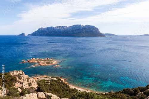 Sardinia. Amazing aerial view of crystal clear emerald blue turquoise Mediterranean sea and island Tavolara. Awesome Sardinian landscape. Italy.