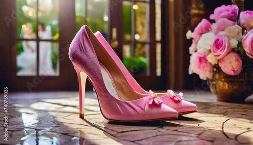 satin pink high-heeled wedding shoes stand on the floor, bride's outfit, footwear, delicate beautiful background