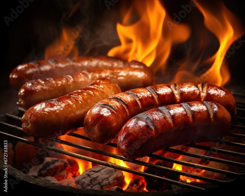 Sausages on the grill with fire flames are delicious.