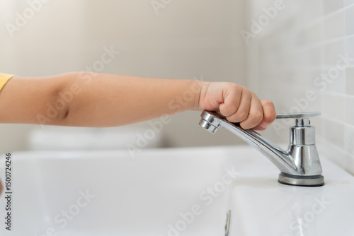 Save water. Little kid keeps turning off the running water in the bathroom to protect environment. Greening planet, reduce global warming, Save world, life, future, risk energy, crisis , water day.