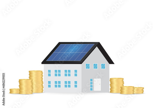 Saving Money and Energy with Solar Panel on the Roof of House. Solar Energy and Renewable Energy Sources. Clean and Green Energy. Vector Illustration.
