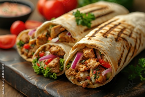 Savory Grilled Chicken Burritos Shawarma Served on a Wooden Platter in a Rustic Kitchen Setting
