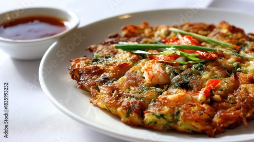 Savory Seafood Pancake With Shrimp And Scallions Served With Dipping Sauce
