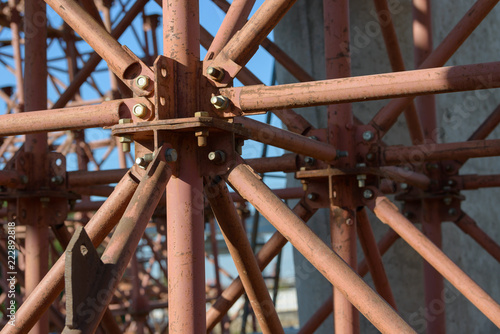 Scaffolding Elements Construction. Metal scaffolding tubes and bars. Construction site details. Bridge support.