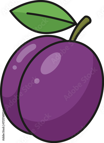 Scalable vector illustration of a ripe purple plum with green leaf for graphic design
